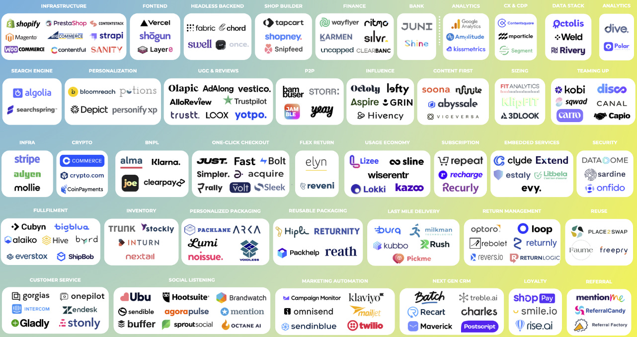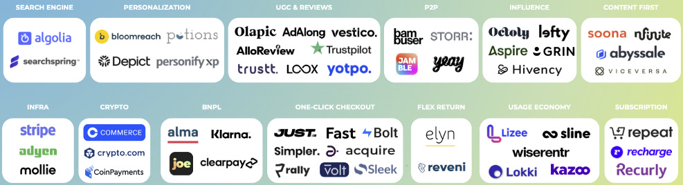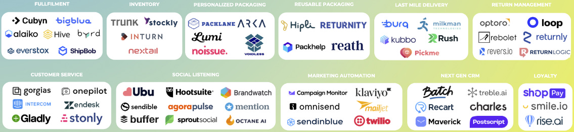 Enablement refers to the digital tools used to facilitate the set up of online branded stores and to manage business activities. These include eCommerce platforms, payment gateways, inventory and order management systems, reporting tools, and more. SMBs rely on eCommerce platforms (Shopify, GoDaddy, Wix, etc.) to provide an end-to-end solution for their business activities. They also connect with third party apps via APIs to provide added functionalities, allowing tech providers to scale with their merchant customers as they grow. Platforms like Shopify and Squarespace have democratized eCommerce infrastructure, empowering sellers to quickly launch D2C in a cost-effective, efficient way. This trend will continue as more custom tech stacks are enabled, which I’ll talk more about later.